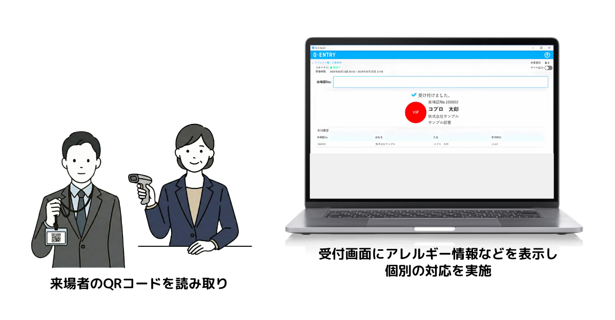 さらに、お名前とQRコードが記載された入場パスを持ってもらいたいということで、QRコードを読み取ったタイミングで事前に印刷しておいた入場パスをお渡しする形でご対応いただきました。
